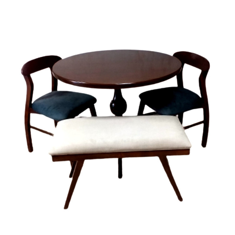 میز پایه گلدانی صفحه از پایه جدا ابعاد نیمکت 37در87 رنگ چوب ثابت قهوه ای تیره تنوع انتخابی برای پارچه است که هر سه صندلی یک رنگ میشوند مثلا اگر شما رنگ زرد انتخاب کنید دو صندلی و نیمکت زرد میشوند